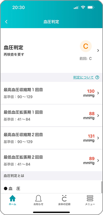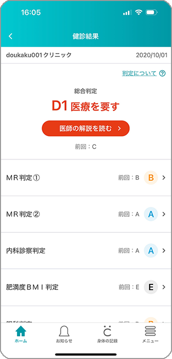 総合判定と各項目の判定が一目でわかります。