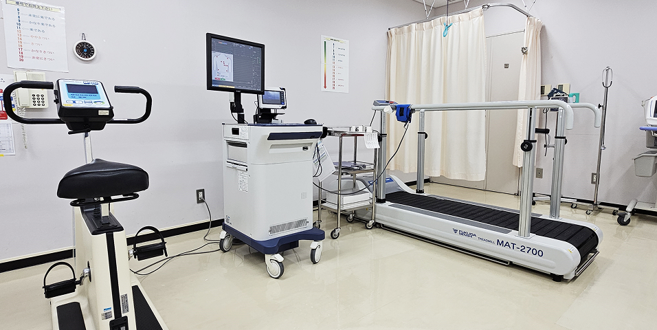 運動負荷試験は、安静状態では出現しにくい隠れた心血管系を中心とする病気を調べるために行います。また運動中の血圧や心拍数の変化から運動療法の目安となる情報を得る事が出来ます。