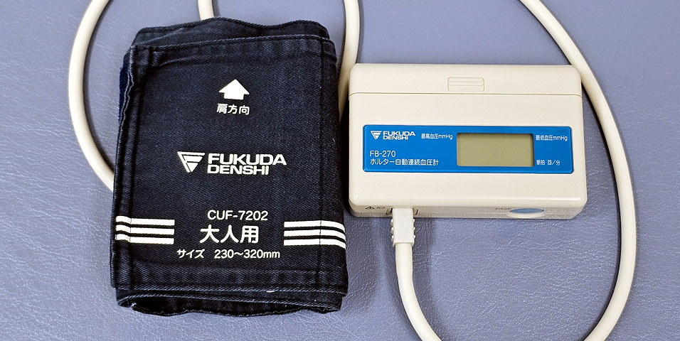 血圧値は時々刻々と変化をしており、外来時の血圧測定のみでは血圧管理に限界があります。24時間、定期的に血圧を自動測定することにより、高血圧、白衣高血圧、仮面高血圧、日内変動パターン(夜間高血圧、早朝高血圧、職場高血圧等)の診断と薬効、薬効持続時間の判断に有用です。