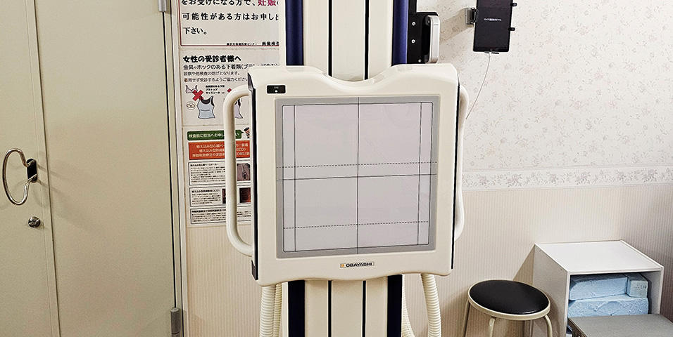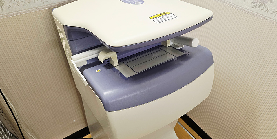 乳房撮影の専用装置にて、緻密な構造の乳腺やその中に出来る微細な石灰化、腫瘤を撮影します。 乳房をよく広げ、圧迫することにより、細かな部分まで描出され、乳がんの早期発見にもつながります。 乳房を圧迫するときに、痛みや不快感があったら遠慮なくお申出ください。 センターでは、女性技師が撮影を担当しています。